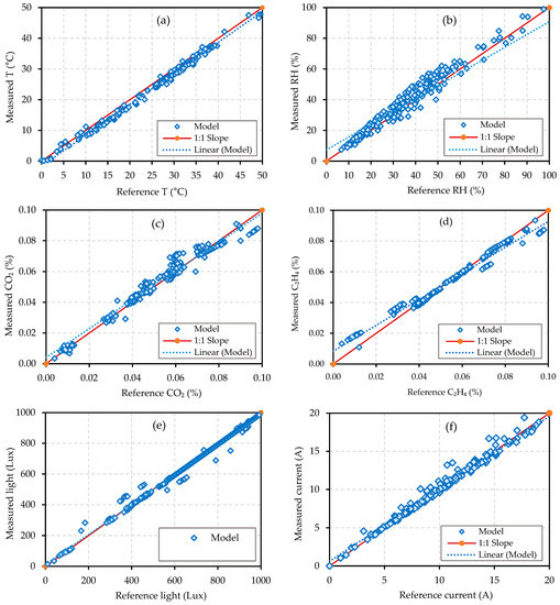 - To calibrate the current intensity Load_CellX03 with HX711 amplifier, power, and electrical energy consumption, the reading of the current sensor, calculated power, and calculated energy consumption were compared with the reading recorded by three-phase power and harmonics clamp meter (UNI-T, UT243, Uni-Trend Technology Co., Ltd. Dongguan, Guangdong, China) under different current intensities consumed by a heater coil.