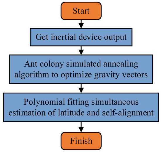 where , and is the gravitational motion vector described in the -frame. Optimal estimation of the attitude array can be accomplished by using the equation relationship of all moment vectors of Equation (7) under the condition of known latitude. Then, the attitude array is obtained in real time during the alignment process by combining the calculation results of Equation (5) with the relationship of Equation (6). However, under the condition of unknown latitude, both of the equations cannot be calculated, so we propose an polynomial fitting estimate (PFE) algorithm with time as the independent variable, and latitude estimation and self-alignment are further realized according to the fitting results of the parameters. The specific steps of the method are shown in Figure 1.