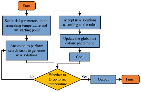 The ant colony algorithm is essentially a positive feedback mechanism, but the pheromone generated during the initial iteration is very limited, so the solution speed is slow, and it is easy to fall into the problem of local optimum in the later stage. Therefore, a simulated annealing algorithm is introduced on the basis of the ant colony algorithm [23,24,25,26]. The annealing algorithm generates an optimal solution quickly with a certain probability criterion, so it effectively addresses the problem of the ant colony algorithm falling into local optimum, and it can provide additional pheromones for the ant colony so that the whole optimization process converges faster, and the ant colony algorithm can solve the problem of simulated annealing having no feedback mechanism and low solution accuracy [27].