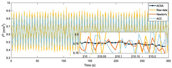 In order to verify the effectiveness of the method proposed in this paper and simulate its application environment more realistically, white noise with a mean value of 0 and variance of 0.002 is added to the output signal of the inertial device in the following simulations. The gravity vector data are compared with the original data after being processed by an artificial ant colony. Newton’s method and the ant colony presented in this paper simulated an annealing two-layer algorithm. Results are presented in Figure 3.