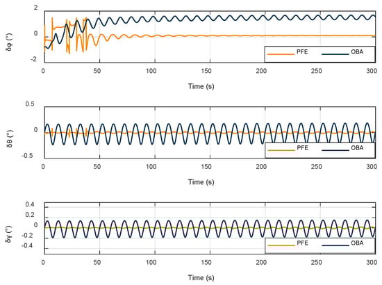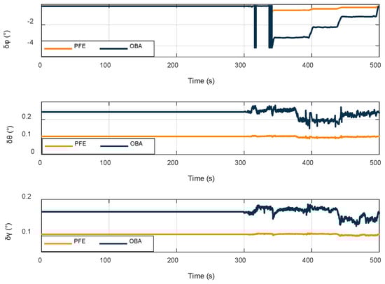 In order to verify the effectiveness of the alignment method proposed in this paper, the method PFE is compared with the OBA method, and the related results are analyzed. Because the OBA method cannot be implemented under the unknown latitude condition, this section is related to the latitude estimation results presented in the previous section. Figure 6 shows the alignment error of attitude angle, where φ denotes the yaw angle, γ denotes the roll angle, and θ denotes the pitch angle.