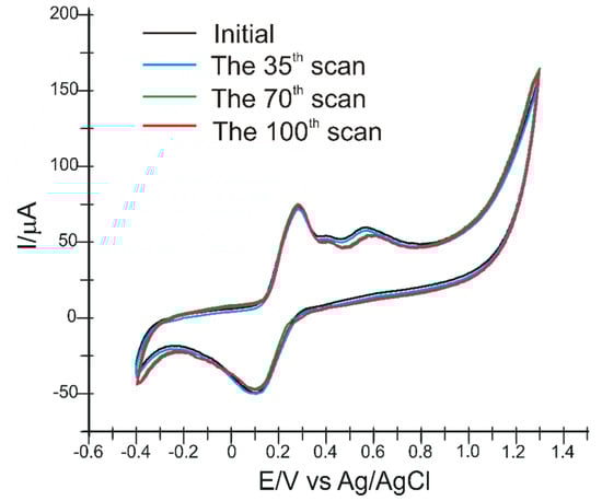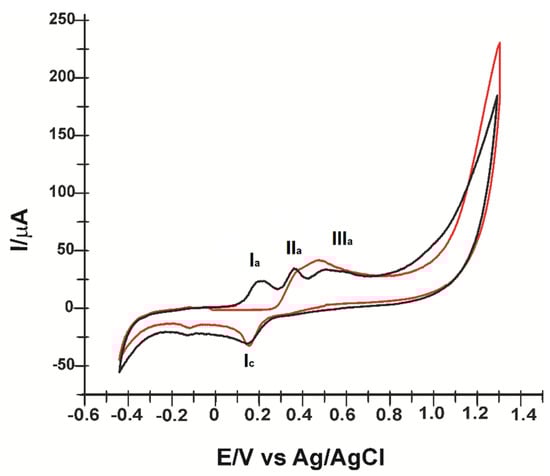 Initially, the recorded cyclic voltammogram showed two irreversible oxidation peaks, IIa at E = 0.388 V and IIIa at E = 0.552 V, related to the beginning of the electropolymerization process. The measured potential value is close to that obtained in other studies [35]. At the second scan (Figure 1), the IIa and IIIa peaks decrease in intensity and the peak pair, Ia/Ic, is highlighted, indicating the deposition of an electroactive film on the electrode surface [35].