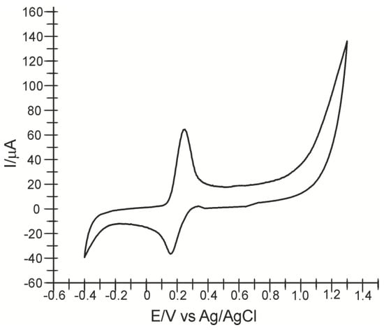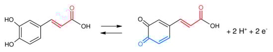 This oxidation–reduction mechanism would be responsible for the effectiveness of caffeic acid as an antioxidant (Scheme 2) [40]. The anodic peak is recorded at Ea = 0.242 V with Ipa = 64.055 μA and the cathodic peak at Ec = 0.160 V and Ipc = −36.461 μA.