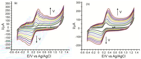Cyclic voltammograms recorded, at different scan rates (0.1–1.0 V·s−1), of CNF/SPE immersed one at a time in 10−3 M ferulic acid solution (a) and 10−3 M caffeic acid solution (b).