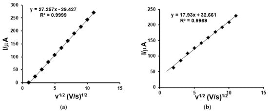 A graph of the anodic peak currents as a function of the square root of the scan rate showed a linear dependence between the two parameters, demonstrating that the redox process is controlled by the diffusion phenomenon (Figure 4).