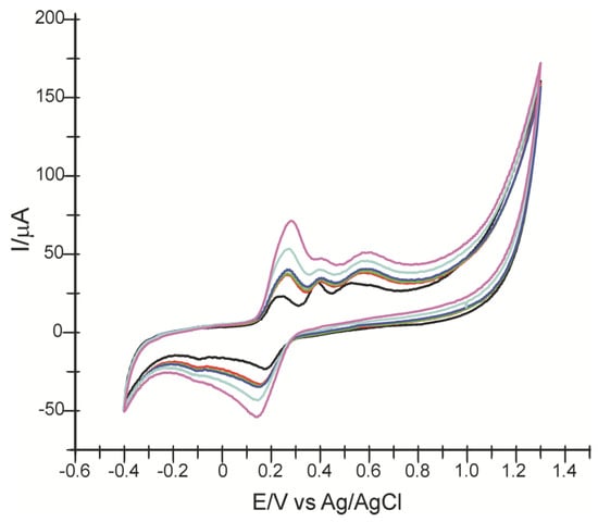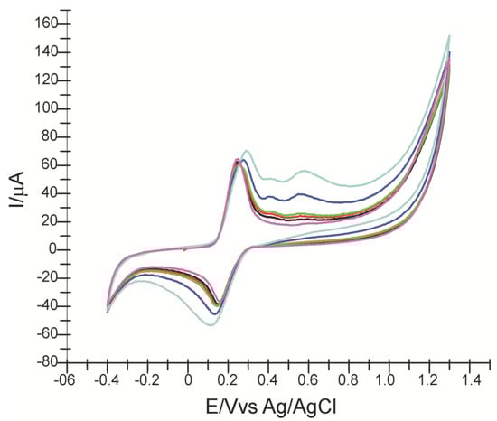Figure 6 shows the cyclic voltammograms obtained from CNF/SPE recorded one at a time in a 10−3 M FA solution, concentration remaining constant, increasing the concentration of CA (10–1000 μM).