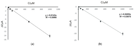 As can be seen in Figure 7, there is a linear dependence between the ΔI and the concentration of FA (a) and CA (b), respectively. The equations of the calibration lines and the limit of detection (LOD) and limit of quantification (LOQ) values obtained are noted in Table 2.