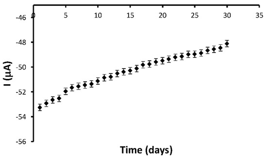 As can be observed in the Figure 9, the electrochemical response was maintained well, with the cathodic current being 90% from the initial current after one month.