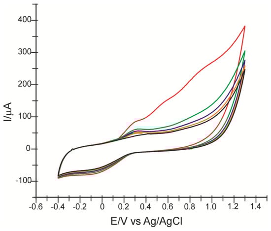 Cyclic voltammograms recorded with CNF/C-SPE immersed in Eye Blend solution (1 cps/50 mL PBS 0.1 M, pH 7.0): first scan—red line, second scan—green line, third scan—blue line, fourth scan—orange line, fifth scan—black line.
