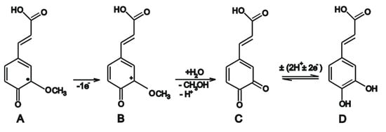 Peaks IIa and IIIa are related by the oxidation of FA, eliminating one electron and one proton, leading to a stable radical, followed by a second electron elimination, by cleavage of the methoxy group, leading to the formation of o-quinone (Scheme 1A), a reaction that explains the reversible Ic/Ia system [35]. At this stage, caffeic acid could be formed, assuming that o-quinone (A) undergoes a second electron transfer leading to the formation of a carbocation (B), which is transformed by hydrolysis into 3.4-dioxocinamic acid (C) and a methanol molecule. During reverse scanning, 3,4-dioxocynamic acid is reduced to caffeic acid (D), which may correspond to peak IIIa [36].