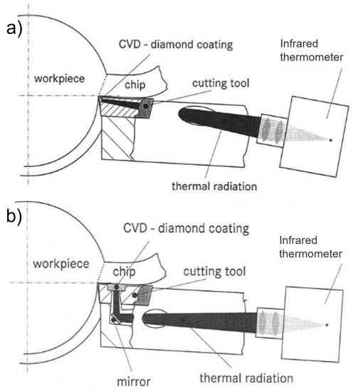 - Müller-Hummel, P.; Lahres, M. Infrared temperature measurement on diamond-coated tools during machining. Diam. Relat. Mater. 1994, 3, 765–769. [Google Scholar] [CrossRef]