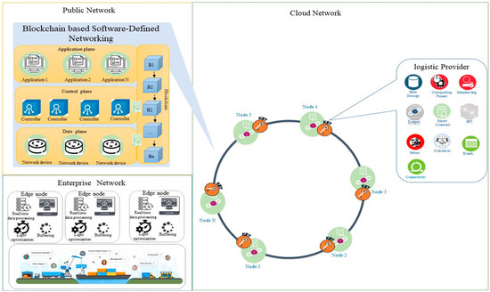 - Enterprise network: The enterprise network is included in the user directory, enterprise applications, and enterprise data. For example, each distribution center has its enterprise network, which is connected to a cloud network via a blockchain-based software-defined network.