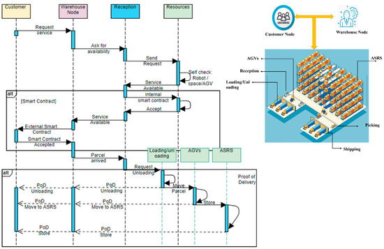 In this method, we have two levels of a smart contract. An internal smart contract providing a contract between internal subcontractors (assets and resources); for example, in the distribution center; this contract applies between reception, loading/unloading, and AGV, or AGV, and ASRS. Second, a smart contract which is an external contract to be applied between the customer node and distribution center node. The PoD process is illustrated in the second section of Figure 4 for loading/unloading resource sharing.