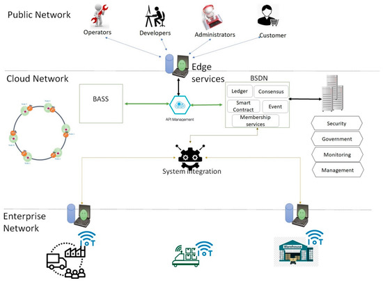 A cloud network is responsible for supplying unlimited blockchain-based services to users and service providers. API management publishes lists and updates APIs in a wide variety of deployment environments. This helps contractors and customers rapidly gather results through the discovery and reuse of the existing assets and resources. BSDN should interface with the blockchain network as part of its operation. It achieves by using the interfaces provided by the miner node. BSDN supports essential capabilities for blockchain solutions in a node. While each miner node is set up and implemented differently, these core capabilities should be considered in BSDN and solutions. It consists of a ledger, consensus algorithm, smart contract membership services, and event management.