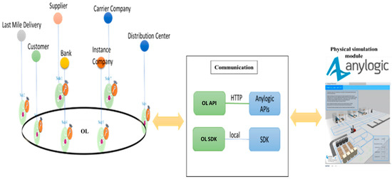 The resource-sharing platform involves a significant number of different resources and assets which are associated with various third-party service providers (3PL), such as trucks, trailers, material-handling systems, and storage systems. Analyzing this type of system in a real environment is infeasible because of the long period that would be required for the development of resources for each service. It is also very difficult to test the multiple scenarios when attempting to compare alternative solutions. One way of overcoming this problem is to use a simulation platform that behaves like a real system. We developed a simulation platform to evaluate the potential benefits of employing OL. Figure 6 illustrates the developed simulation platform with its three main components. The main advantage of this simulation platform is that it can distinguish the software level from the hardware level. Therefore, as with the real implementation, each service has three different entities in this simulation platform: (1) the agent inside the physical simulation module, which simulates the capability of the hardware and local decisions such as a vehicle, ASRS, robot, etc. (2) the communication channel for each specific service which is responsible for transaction between OL module and physical simulation module. (3) the OL module is an implementation of the proposed platform.