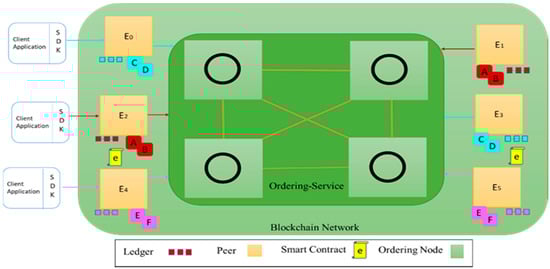 To develop OL by Hyperledger Fabric, we set up a multi-host blockchain network with three physical machines. We created OL with one Orderer organization and six peers’ organization. Figure 7 shows the developed blockchain network. Peers E0 and E3 connect to the Cyan channel for chain codes C and D, and peers E2 and E1 connect to the Red channel for chain codes; A and B, and peers E4 and E5, connect to the Pink channel for chain codes E and F. We implemented a smart contract with a following endorsement policy appropriate to peers. We also implemented practical Byzantine fault tolerance (pBFT) as a consensus algorithm.