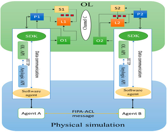 This module is responsible for providing the interaction between the agent in the physical simulation module and OL. Figure 8 shows how agents in the physical module interact with peers to retrieve the ledger in the OL module. Ledger request connections involve a simple three-step dialogue between an agent and a peer. Ledger update interactions are a little more involved and require two extra steps. Agents connect to peers when they need to access ledgers and smart contracts. Via a peer connection, agents can execute smart contracts to query or update a ledger. The result of a ledger query transaction is returned immediately, whereas ledger updates involve a more complex interaction between agents, peers, and orderers. In Figure 8, agent A links to P1 and evokes smart contract S1 to inquire or update the ledger L1. P1 evokes S1 to create a response proposal that contains a query result or a ledger update. When agent A gets the response, then the process is completed. After that, for updates, agent A creates a transaction that contains all responses, then transmits it to O1. O1 accumulates transactions through the network into blocks and distributes these to all peers. When transactions are sent to P1 via O1, P1 validates the transaction, then applies to ledger L1. Once L1 is updated, P1 generates an event received by A to signify completion.
