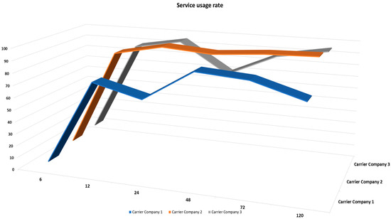 SUR represents whether the manufacturer or distribution center can control the requested service (resource sharing). If the utilization rate is high, the service requester can communicate with the 3PL in time and obtain updated information. If the information-sharing efficiency is low, the service requester cannot know in time which 3PL has the idle resources. As a result, manufacturers or distribution centers cannot make immediate arrangements, which may hold products in manufacturers or distribution centers for a long time. For the 3PL, if the manufacturer or distribution center fails to request service in time, resulting in a low SUR, it will reduce the economic efficiency of the 3PL. For the 3PL, when the manufacture or distribution center still needs service, but the SUR is still low, the manufacture or distribution center and the 3PL have low information sharing capacity and low communication efficiency, which will also reduce the cost economic efficiency of the 3PL. The statistical results are shown in Figure 9. The result shows that the SUR is very low at the first 6 h, but after 12 h, the SUR normally is more than 80 percent. This happens because we didn’t consider the warming time in the system.