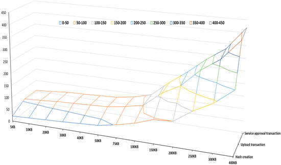 The performance analysis of the core OL network was conducted to evaluate the impact of transaction size on transaction response times, known as latency. Latency is one of the main key KPIs to evaluate the performance of the blockchain network in the platform. We consider three types of transaction time to deliver a wide-ranging assessment of latency, hash creation time, transaction to block via agents, and service endorsement time. Figure 10 presents a surface chart of the latency of various transaction sizes, ranging from 10 kB to 400 kB. We consider this range because it can support all transactions in the OL. It proves the trend that the total time increases with the transaction sizes. Moreover, the increasing rate enlarges when the total transaction size is over 150 KB, which provides insights for block size configuration to enable an OL with high performance.