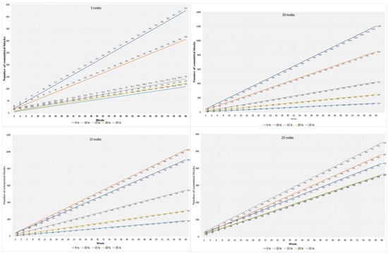 We recorded the network operation of the number of committed blocks every minute for all experiments. Figure 12 shows the number of committed blocks for different block sizes. We categized these results by considering the different numbers of nodes in the network 5, 10, 15, and 20, respectively. The number of transactions is 5, 10, 15, 20, and 25 per second. The result shows that the network’s performance is reduced by increasing the number of transactions. Nevertheless, when increasing the number of nodes to 15 and more, the network performs differently. With 15 nodes block committed to 10 ts is more than 5 ts. For example, in the first 10 min of simulation, 175 blocks are committed to 10 ts transactions, a number 20 more than 5 ts. Better performance is observed when committing 20–25 transactions to a block than when committing 5–10 transactions to a block for the network of 20 nodes. The frequency of generating new blocks is inversely related to the block size if a small block size and a constant transaction generation period are used. Increasing the frequency of block generation leads to an increase in the number of transactions within the protocol, most of which are sent from each node to all others. As a result, the network becomes overloaded, reducing performance and leading to a decrease in the number of committed blocks.