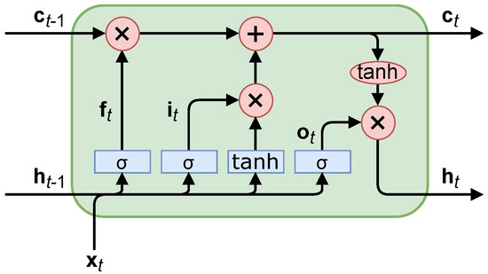 where matrices W and vectors correspond to the trainable gate parameters (input, forget, output), (shown in Figure 1) is the sigmoid activation function, , and is a concatenation of the vectors. The equations for the LSTM outputs are