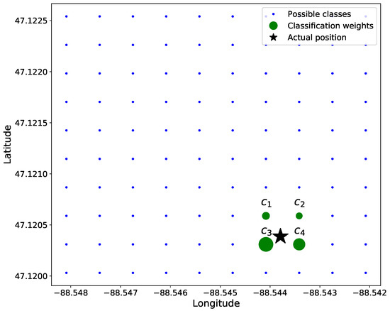 Our data are 2D in nature with variations in only latitude and longitude; thus, . To simplify calculations, the distance between adjacent classes—i.e., grid positions —is normalized to be 1. To ensure that only adjacent classes in to any given ground truth location are non-zero-valued, we chose . For example, in Figure 4, the green circles would be the only elements of that are non-zero-valued.