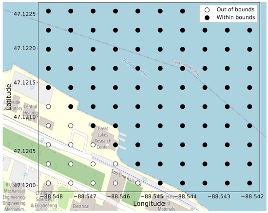An example of the grid location classes for a grid is shown in Figure 5. The “out of bounds” labels on the bottom-left corner in Figure 5 correspond to outside the banks of the Keweenaw Waterway, and no data are present on these grid location classes.