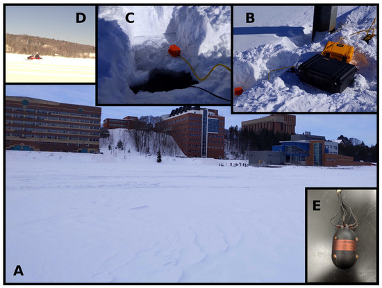 Conditions under which the experiments were conducted: (A) shows the Keweenaw Waterway frozen over, looking SSW at Michigan Technological University; (B) shows the sensors and data acquisition system on a dock near the Great Lakes Research Center; (C) shows a close-up of where the sensors are deployed in the water; (D) shows a snowmobile driving in one of the experiments; (E) is a close up of the AVS.