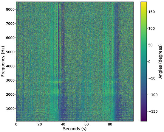 The acoustic data were recorded in time-series at a sample rate of Hz using a National Instruments cRIO-9035 with NI-9234 data acquisition cards. The sample rate was set to Hz since the sensor’s 3 dB cutoff frequency was at 8000 Hz; thus, frequencies above 8000 Hz were not used in post-processing. The data were transformed into an azigram using Equations (1)–(3). The STFT used a Hanning window, overlap, and a segment size of 1706 samples to yield a time step of s. Figure 7 shows an example of the azigram of the first 100 s of data. Note there are two snowmobile passes in the azigram, around the 40 and 85 s marks. The snowmobile drives by the sensor around the 40 s mark (heading eastwardly), turns around, then drives by the sensor again near the 85-second mark (heading eastwardly again).