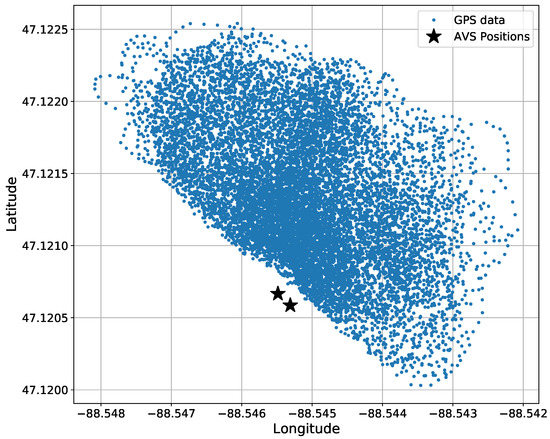 Bird’s eye view of the total amount of GPS data in all datasets before 20-times interpolated. GPS data are accumulated from 8 experiments. The two AVS positions are shown for a reference.