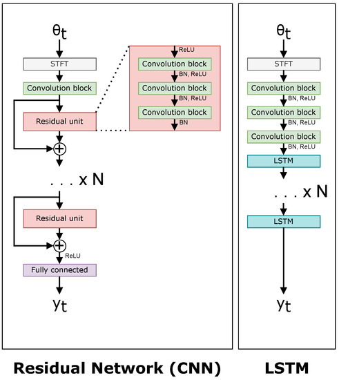 The neural networks process the same data, i.e., the data are pre-processed in the same manner for every neural network. The azigram data are shaped to use the prior 512 time steps for a single prediction. Each AVS’s azigram frequencies are downsampled to contain 256 frequency bins. The two AVS’s frequency data are concatenated along the frequencies; hence, the input data are a azigram in the neural network. Each network predicts a single output value, , at the final time step of the sample. In other words, the networks’ input data are a sliding window of 512 samples, and each network predicts the new location at the end of the 512 window, then the window is moved forward by 1 sample from a time window of to .