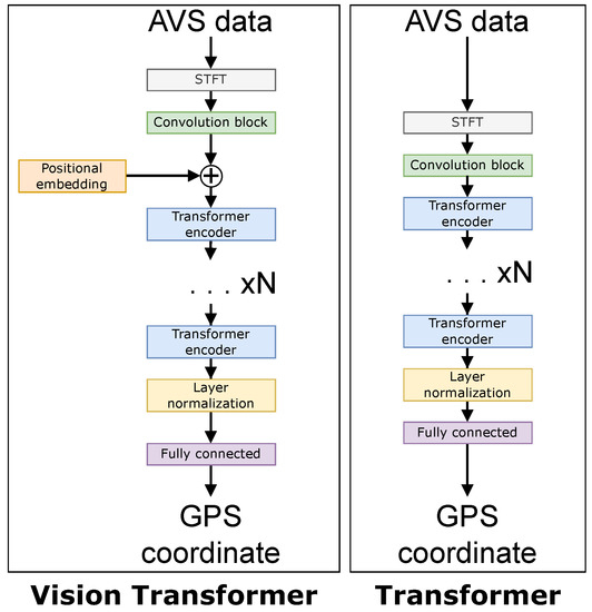 ML has been used previously in acoustic localization approaches with great results [3,6,7,8,9,10]. Long Short-Term Memory (LSTM) neural networks have been shown to analyze time-series acoustic data with success [9,10,11,12]. LSTM is designed to analyze data with time dependence [11], but its computational complexity causes difficulty in training large networks, which is shown in Section 3. A newer concept is to utilize Vision Transformer (ViT) architectures [13,14]. The ViT is a modified version of a Transformer neural network [15,16] where the ViT is specialized for data with a large number of dimensions, e.g., acoustic spectrum data. The ViT has been used extensively in computer vision and image analysis [13,17,18], but to date, there has been no paper published on ViT-based localization for through-ice or underwater acoustic localization.