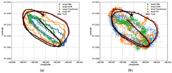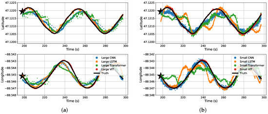 The results may be misunderstood simply reading Table 3 and Table 4. For a visual representation of our data, we will start off with the predicted coordinates for what the MSE actually represents. Figure 11 shows a section of a time-series representation of the data using both the latitude and longitude positions of the snowmobile and each algorithms’ predicted positions of the snowmobile. Figure 11 can be misleading where one may see the CNN and Transformer networks seem to be on-par with, or close to, the results of the ViT. Mapping these results to an plane, Figure 12 shows a more critical view for what these small amounts of errors indicate. Even with a top-down view of the experiment, the ViT tracks the snowmobile at high accuracy in comparison to the other models. For the ViT, it should be noted that its mean accuracy is m. This is very close to the accuracy of our GPS receiver: the reported 95th-percentile mean error is m in Minneapolis, Minnesota, which is relatively near Houghton, Michigan, from 1 January to 31 March 2021 [26], and the GPS was recorded in a relatively open area. Therefore, the ViT appears to have reached the maximum achievable accuracy of our experimental truth data. That is, our truth data are not accurate enough to verify errors significantly better than m. These significant results are further discussed in Section 4. Almost all of the test data are similar to Figure 11 and Figure 12, shown in Appendix A Figure A1.