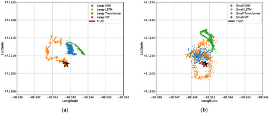 Although most test data are similar, there exists a section of the test data where a snowmobile idles (does not move) for 25 s, and the networks perform relatively poorly with these data. Figure 13 shows the predicted locations from each network at the time where the snowmobile is idling (not moving) in a bird’s eye view. The Transformer, CNN, and LSTM networks all struggle to notice when the snowmobile is idle. Those three neural networks were not able to notice the stationary source and continued to predict movement. Note that the LSTM seems to follow a circular pattern, which indicates the network is anticipating the snowmobile to drive in this pattern.