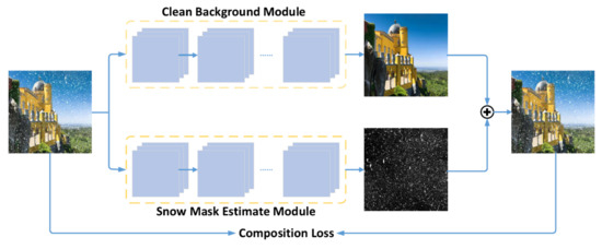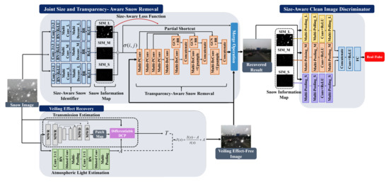 - Zhang, K.; Li, R.; Yu, Y.; Luo, W.; Li, C. Deep dense multi-scale network for snow removal using semantic and depth priors. IEEE Trans. Image Process. 2021, 30, 7419–7431. [Google Scholar] [CrossRef]