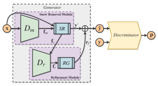 - Jaw, D.W.; Huang, S.C.; Kuo, S.Y. DesnowGAN: An efficient single image snow removal framework using cross-resolution lateral connection and GANs. IEEE Trans. Circuits Syst. Video Technol. 2020, 31, 1342–1350. [Google Scholar] [CrossRef]