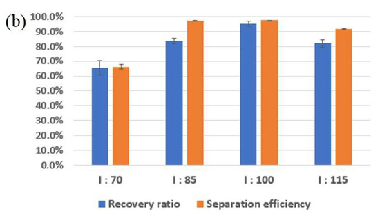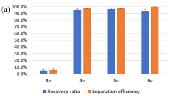 Figure 4a shows the recovery ratio and separation efficiency of the particles in the various voltage conditions at the sample flow rate of 100 μL/min and sheath flow rate of 70 μL/min, respectively. At 4 V, the recovery ratio and separation efficiency were >92% and >95%. Figure 4b represents the recovery ratio and separation efficiency whilst varying the sample flow from 70 μL/min to 115 μL/min at a fixed applied voltage of 4 V. The recovery ratio improved from 65% to 99%, while the separation efficiency changed from 67% to 96.3%, as shown in Figure 4b. Additionally, the maximum enrichment factor almost reached 108. On the other hand, the recovery ratio (95% from 96.3%) and separation efficiency (97% from 99%) decreased a little without the serpentine channel for prefocusing in the same conditions. However, the enrichment factor dramatically decreased from 108 to 23. This means that the hybrid microfluidic channel with prefocusing channel works better for the enrichment of targets as well as for the separation and recovery of targets (Supplementary Video S1).