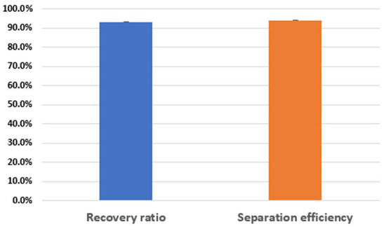 As a proof of principle of separation performance, we selected two kinds of size different microalgae cell named Chlamydomonas reinhardtii (CC-125, 2~10 μm, 1.41 × 106 cells/mL) and Haemotoccocus lacustris (20~30 μm, 1.35 × 105 cells/mL), and tested the separation experiments for the mixture sample of the microalgae cells (Supplementary Video S2). The prepared sample was injected into the inlet port of the hybrid microfluidic device, while electrical power was applied to the PZT to drive acoustic radiation force in the acoustofluidic channel, as shown in Figure 1. For the applied voltage of 14 V, sample flow rate of 300 μL/min and sheath flow rate of 300 μL/min, large Haemotoccocus lacustris moved to the center outlet (Fout,c), while small CC-125 moved out to the combined side outlet (waste outlet (Fout,w)). The experimental results showed that the recovery ratio and separation efficiency were >93.2% and >94%, with an enrichment factor of 261, as shown in Figure 5. It means that the proposed device works properly in separating cells as well as microbeads.