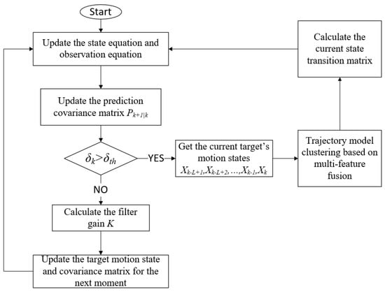 Set the preset error threshold as . When is not greater than the preset threshold , keep the state transition matrix unchanged; otherwise, if > , then update the state transition matrix . By using the multi-feature fusion-based trajectory clustering algorithm proposed in Section 2.2 for target trajectory clustering, the approximate motion trajectory model of the target can be obtained. The current state transition matrix of the target can be inferred by the trajectory model. If the target moves in a straight line at a uniform speed, the state transition matrix is