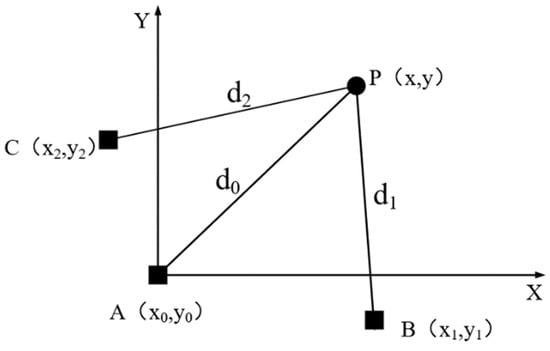 In Figure 2, point P represents the radiation source, and points A, B, and C represent the three passive sensors that track the target P. Assuming that at time , the coordinate of the radiation source is , and the position coordinates of the three passive sensors are , , . The distances of the radiation source to the three passive sensors are , and , respectively, which have the mathematical relationship with the target position as