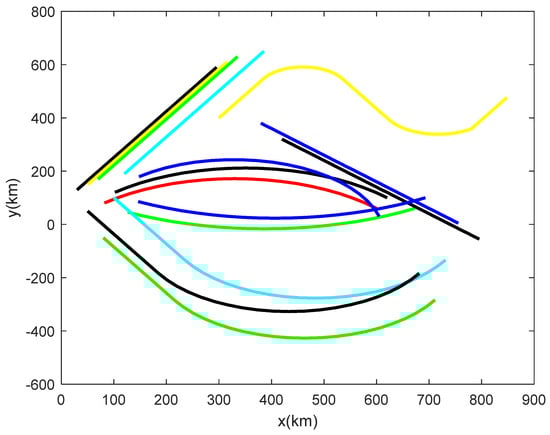 Different motion models of maneuvering targets are simulated in this subsection, and the 15 trajectory samples shown in Figure 4 are used as the processing objects of the multi-feature fusion trajectory clustering algorithm. Among them, there are six curves of the uniform linear motion model, five curves of the coordinated turning motion model, and four curves of the mixture of a uniform straight line and a coordinated turning.
