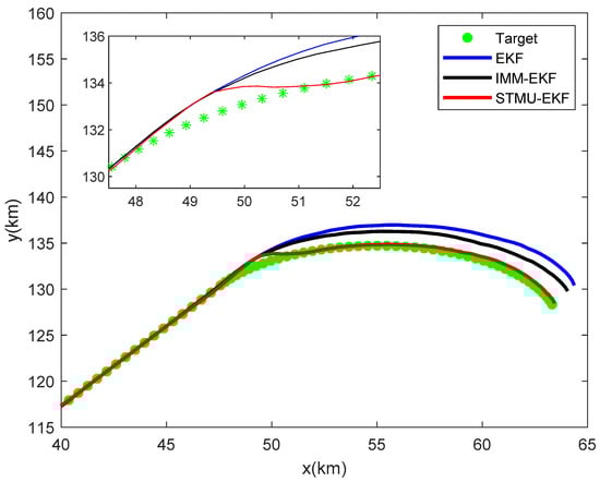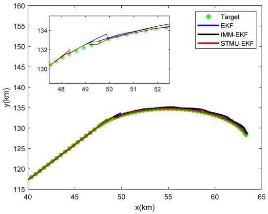The STMU-EKF algorithm is simulated for high-maneuvering target tracking, compared with the EKF algorithm and the IMM-EKF algorithm. The state transition probability prior matrix of the IMM-EKF algorithm is ; that is, the initial probability of the uniform linear motion is 0.9, while the initial probability of the coordinated turning models is 0.05.