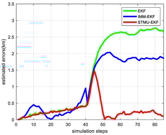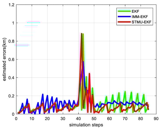 Track the target within 85 sampling intervals, and the target tracking traces of the EKF algorithm, the IMM-EKF algorithm, and the STMU-EKF algorithm are shown in Figure 5. The target tracking errors of the EKF algorithm, the IMM-EKF algorithm, and the STMU-EKF algorithm are shown in Figure 6.