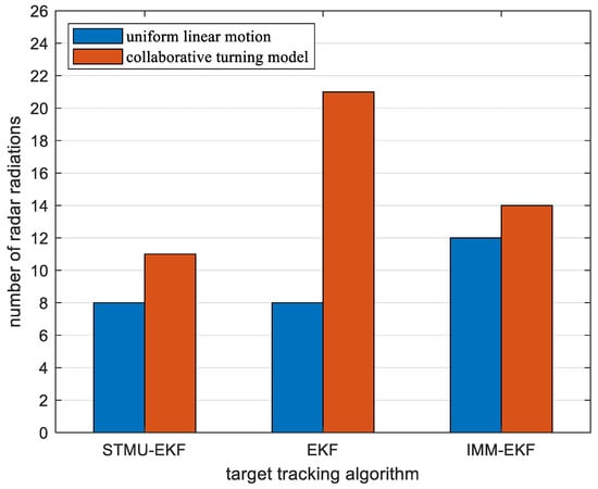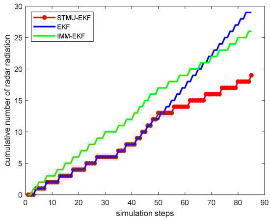 In the first 40 sampling intervals, that is, when the tracking target is in a uniform linear motion model, the error values of the EKF algorithm and the STMU-EKF algorithm both fluctuate within a certain range, and their tracking performance is similar; However, due to the unknown state transition probability matrix, the error of the IMM-EKF algorithm is slightly larger than that of the EKF algorithm and the STMU-EKF algorithm, so the number of radar radiations is also slightly larger.