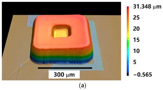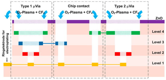 On top of the fifth cured PI film (covering the level 4 metallization, see Figure 2) a 350 nm thick ZnO film was sputter deposited. Using photolithography (photoresist maP 1215) and 12% HCl wet etching, the ZnO was locally removed above the via positions and above the micro-via ring electrodes before dry etching in a barrel etcher (308 PC Barrel Etching System from STS Surface Technology Systems GmbH). The etch gas consisted of 80% O2 and 20% CF4. At 150 W the PI was locally removed within an hour, leaving the stepped clean Au surface and the desired hole down to the level 1 metallization as shown in Figure 3.