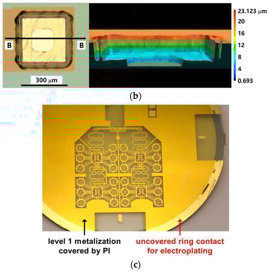 Four-inch borofloat glass wafers (SCHOTT Technical Glass Solutions GmbH) were used as temporary rigid carriers during production. A 10 nm chromium adhesion layer was applied by sputter deposition (Laborsystem LS 440 S from Von Ardenne Anlagentechnik GmbH, Dresden, Germany) using a bezel to produce a 5 mm wide ring at the wafer edge providing sufficient adhesion of the PI films which were spin-coated. For soft baking the PI film, the wafers were heated at 110 °C and 155 °C for 5 min each and then cured at 350 °C in an oven (LCD1-51N-5 from Despatch Industries) for one hour in a nitrogen atmosphere before a new Au layer was sputter deposited (Laborsystem LS 440 S from Von Ardenne Anlagentechnik GmbH). The metal layers were structured using photolithography (Maskaligner EVG®620 from EV Group with photoresist maP 1215 from micro resist technology GmbH); the gold etching solution was made of iodine, potassium iodide and deionized water in the ratio of 1:2:20. The PI + metallization processes were repeated three times to establish the four-level architecture. The Au layers had varied thicknesses to obtain the required resistance values for each layer. Au tracks in Vcc and measuring lines layers were 80 nm thick to obtain a resistance value above 1.5 kΩ. In the electroplating and ground layers, the Au tracks had a thickness of 300 nm and 150 nm respectively to reduce electrical transmission losses.