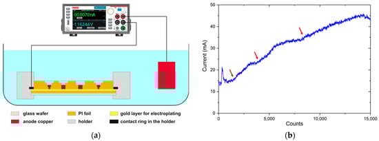 (a) Schematic illustration of the copper electroplating setup; (b) example of measured current over time at constant voltage of 600 mV. The counts in the diagram represent data points which were recorded with a frequency of approximately 12 measurements per second. The red arrows indicate the points where micro-via filling has just reached the next level of metallization.