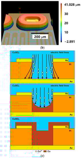 The wafer was fixed in an electroplating holder which couples the level 1 metallization to the current source (Source Meter Model 2450 from Keithley Instruments, LLC) via a circular cathode and then immersed into a sulfate electrolyte consisting of H2SO4 and CuSO4. The anode was formed by an immersed copper block. When the copper had grown and micro-vias were filled, copper continued to grow and solderable copper pads protruding the surface of PI-Film formed (Figure 1a).