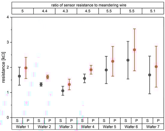 Averaged resistance values from seven wafers with standard deviations as measured at sensor vias (S) and pad (P). The variation in resistance for wafers 5–7 is high compared to wafers 1–4, which was caused by a less stable sputter process for these wafers.