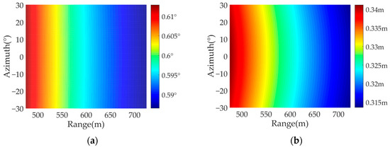 The spatial resolution of AA-BiSAR with moving receiver: (a) the azimuth resolution; (b) the ground-range resolution.